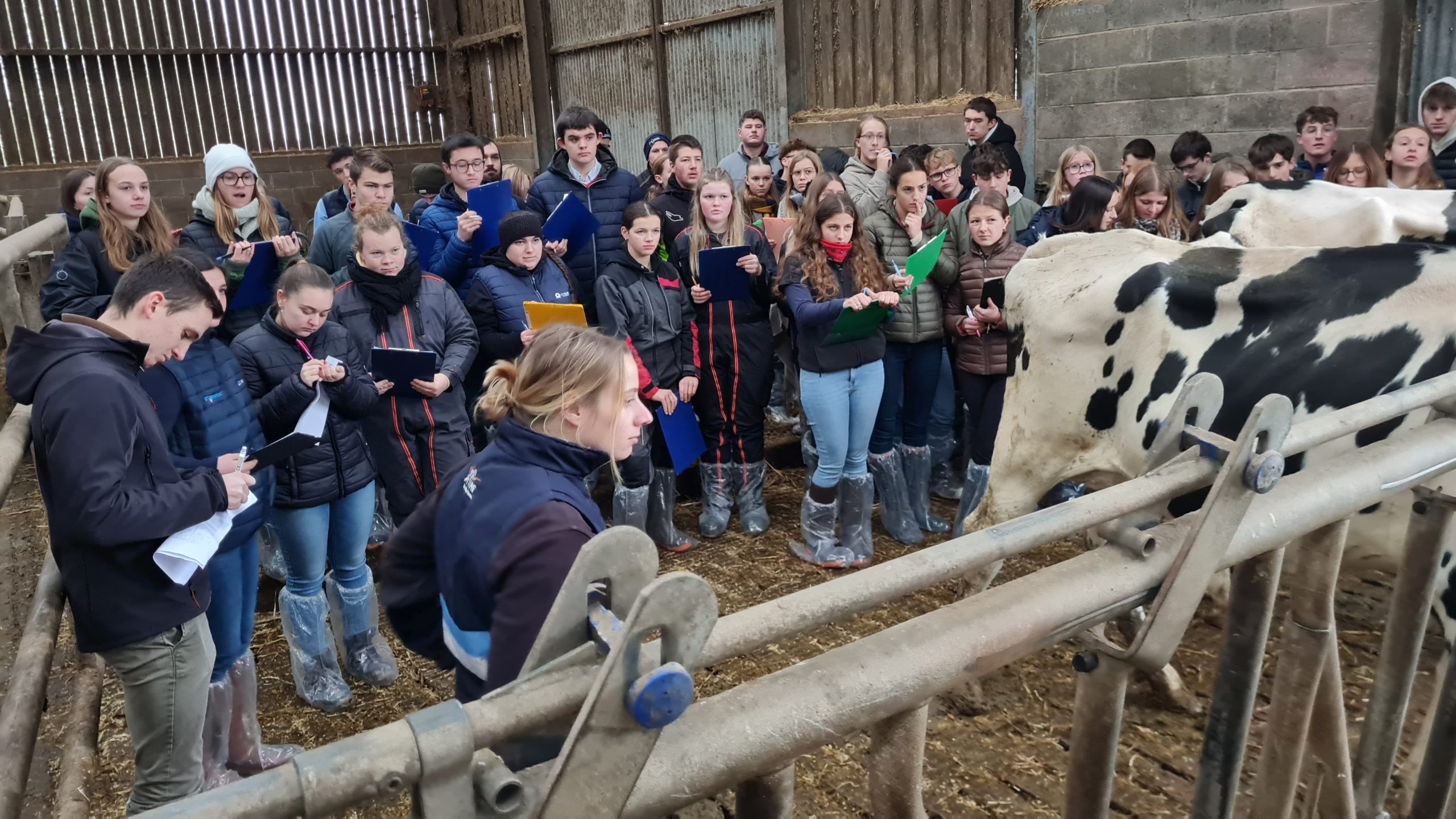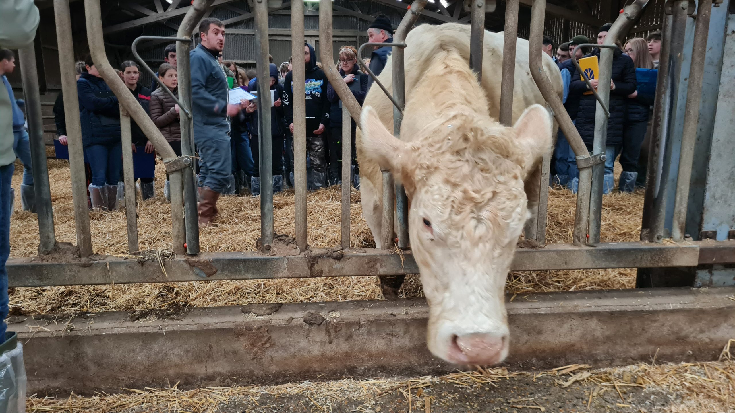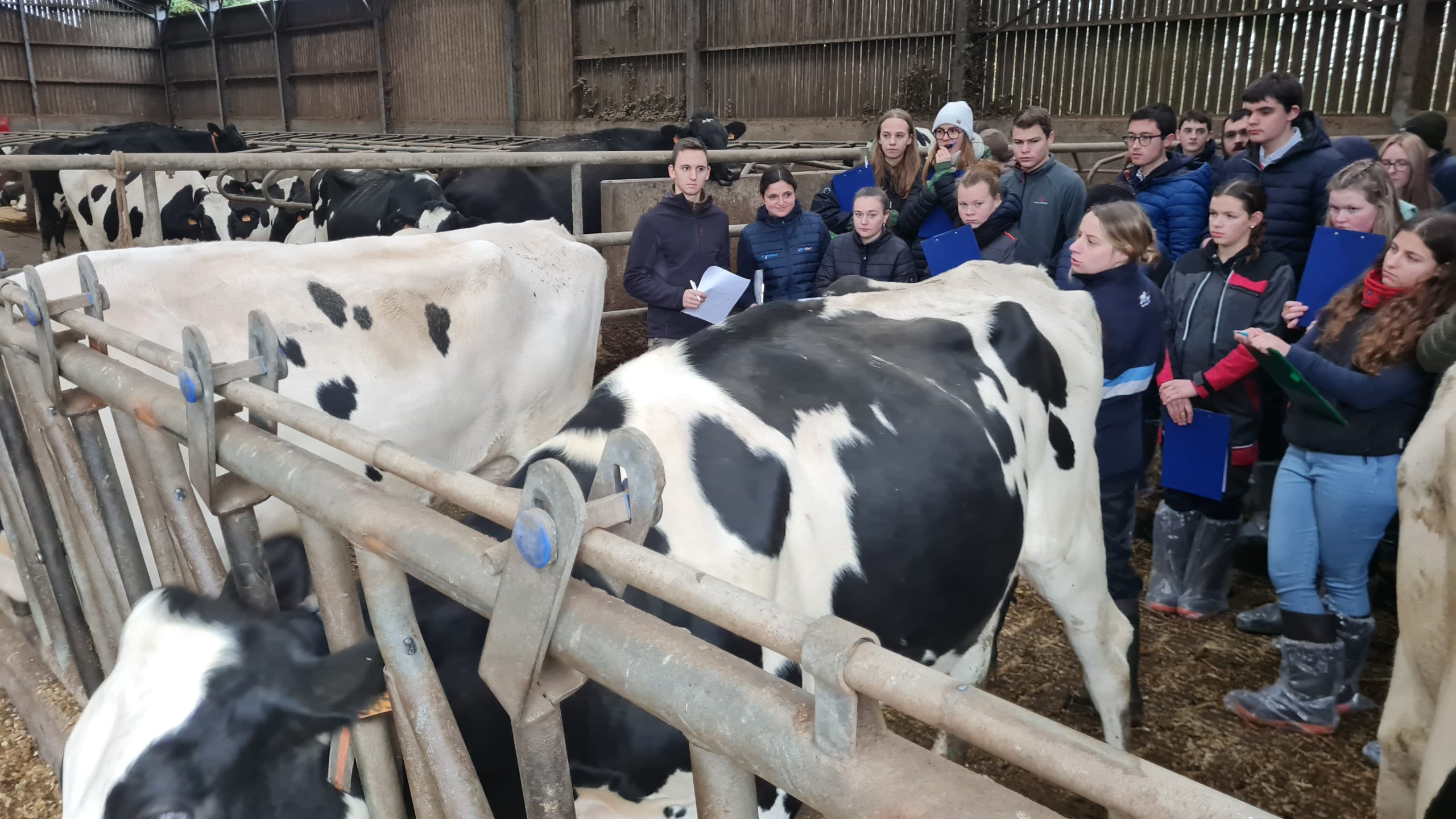 Les techniciens — Suzanne Genéri pour la Prim’Holstein et Mathieu Gonnot pour la Charolaise — notent les bêtes en parallèle des élèves. Le défi ?