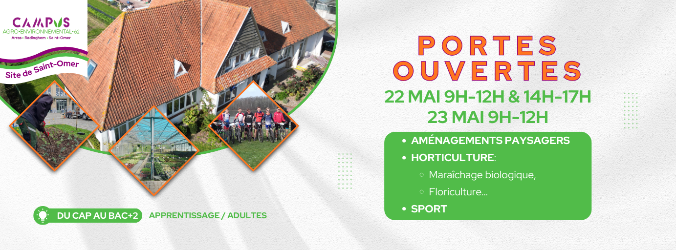 Vendredi 22 mai et le samedi 23 mai 2026, le Campus Agro-Environnemental 62 – site de Saint-Omer vous ouvre grand ses portes. Deux journées rythmées par des animations, des dégustations, des démonstrations et des rencontres pour plonger au cœur des métiers de l’horticulture, des aménagements paysagers, et du sport. Au Campus, on apprend en faisant, et on partage avec passion.